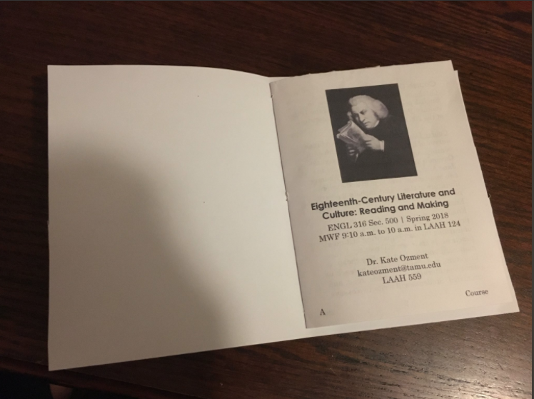 The entire exercise took about 30 minutes of class, including answering questions. Most students left without cutting open their pamphlets, as I suggested using sharper scissors than I had provided to make the edges crisper. I have seen them pull these out of their bags to reference class policies, and it gave a much better picture of the authors we read in the following weeks. While reading John Dryden’s Mac Flecknoe, the students immediately understood how a poet’s work could wrap a pie or be used as toilet paper because they had the same size document in their hands.