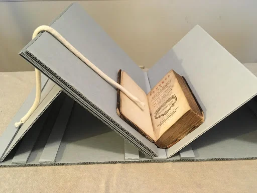 Image of a collapsable book cradle with additional spacer boards to provide more spine support.